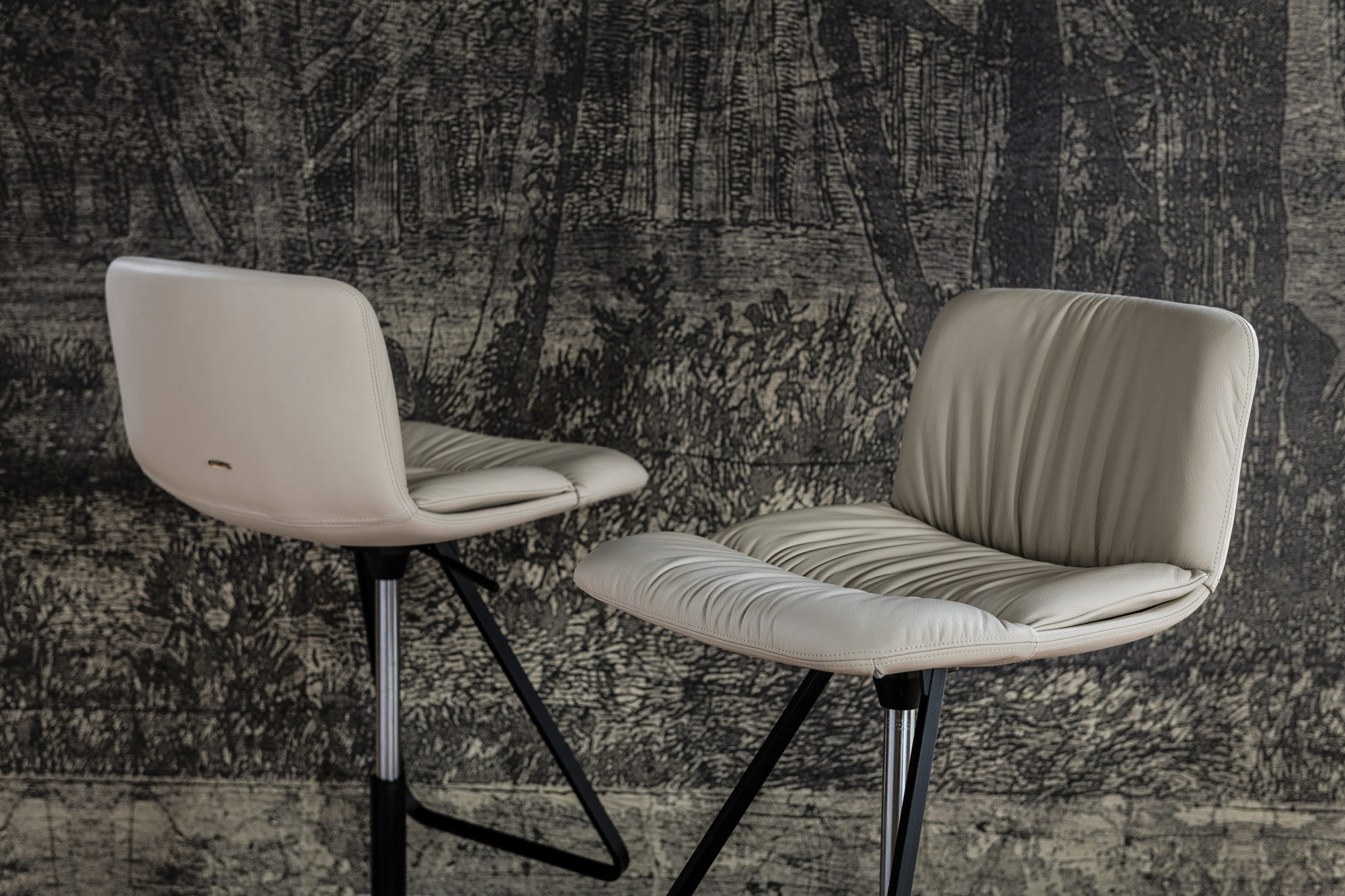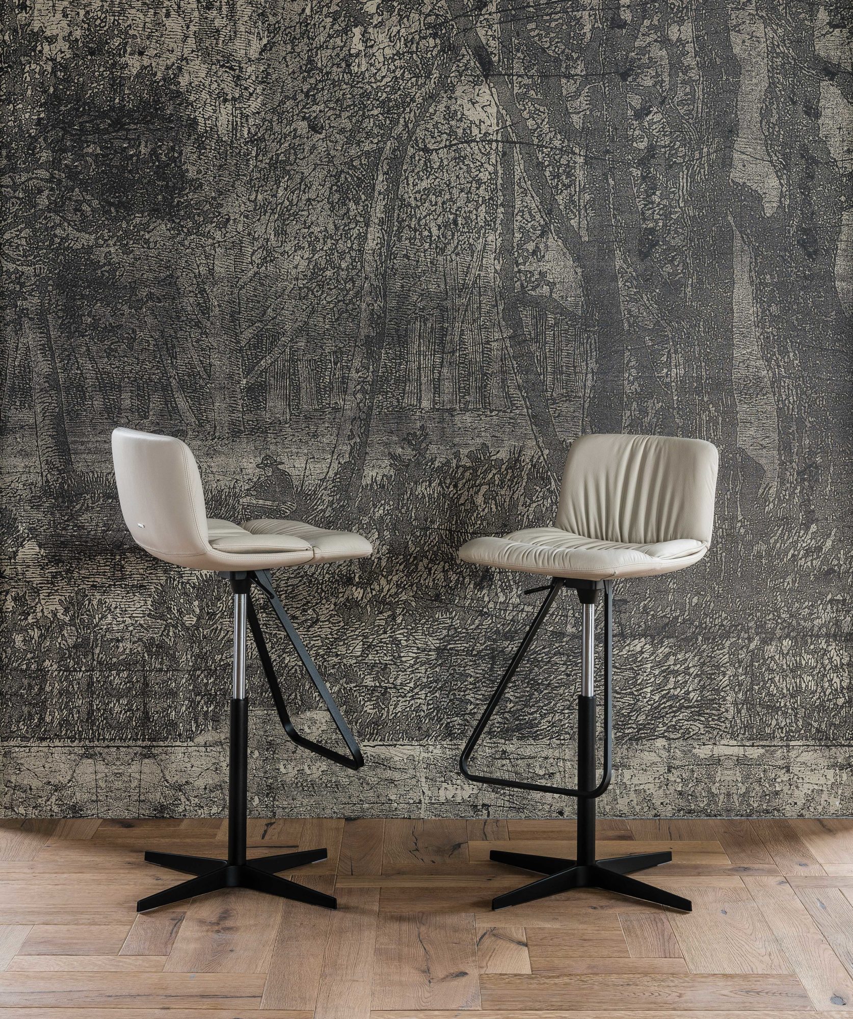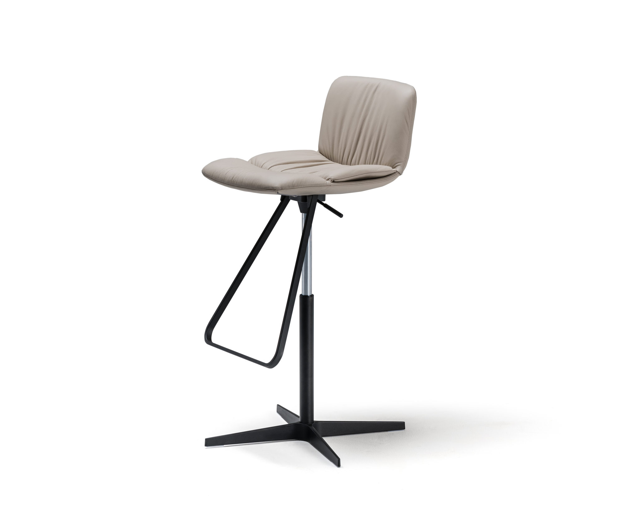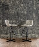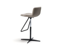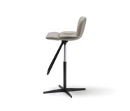Hoker obrotowy o regulowanej wysokości z kolumną z satynowej stali nierdzewnej, podnóżek i tłok gazowy ze stali chromowanej (08) lub z płytą podstawy, kolumną i podnóżkiem w kolorze czarnym (GFM73), tłoczona stal lakierowana i tłok gazowy ze stali chromowanej (08). Rama pokryta tkaniną, nubukiem syntetycznym, skórą syntetyczną lub skórą miękką.