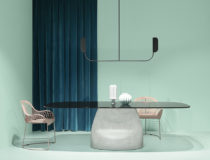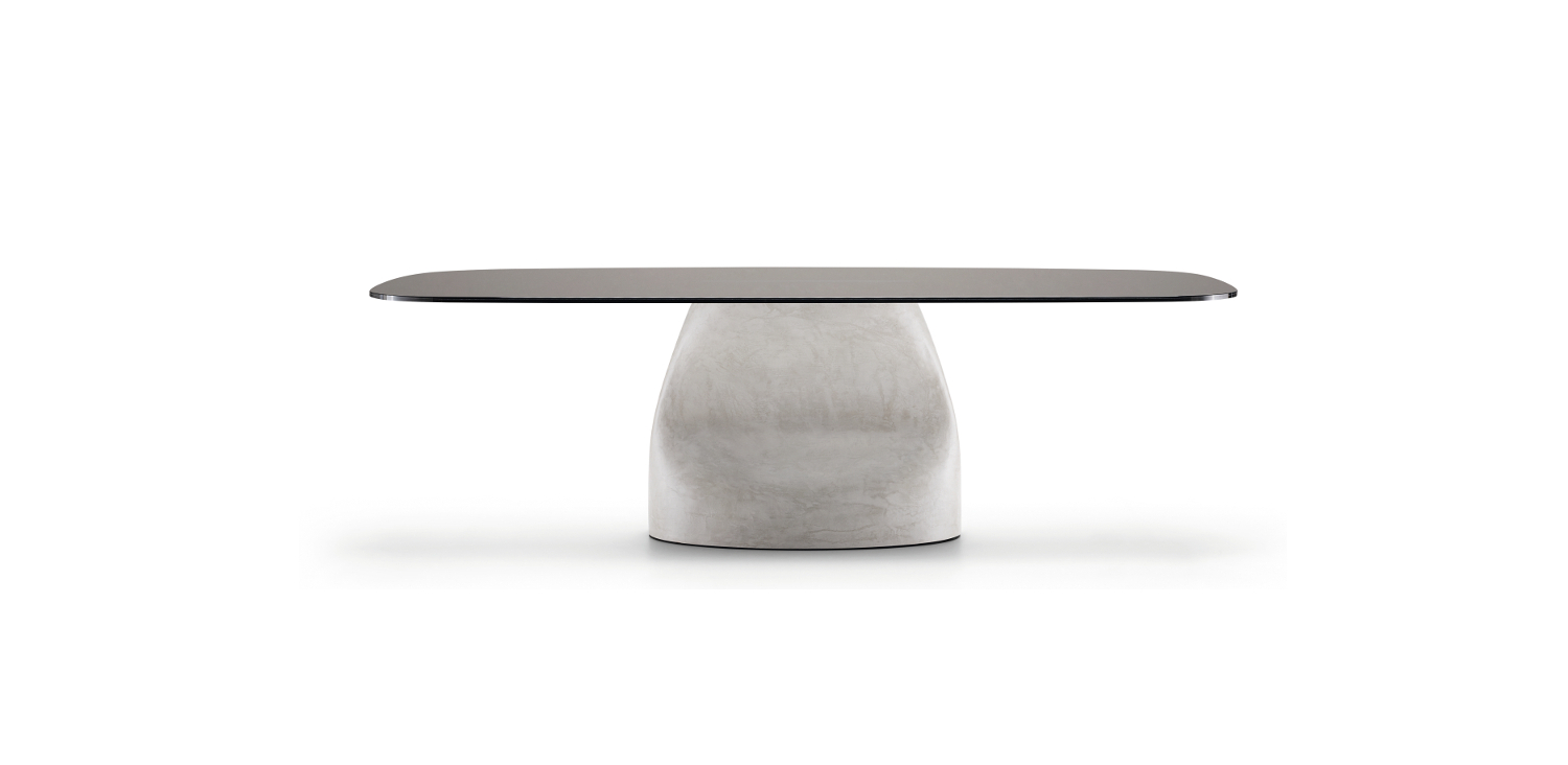 Nierozkładany stół z podstawą Baydur® lub ze szczotkowanego betonu, lakierowaną wkładką stalową i krystalicznym lub krystalceramicznym prostokątnym blatem z zaokrąglonymi narożnikami.