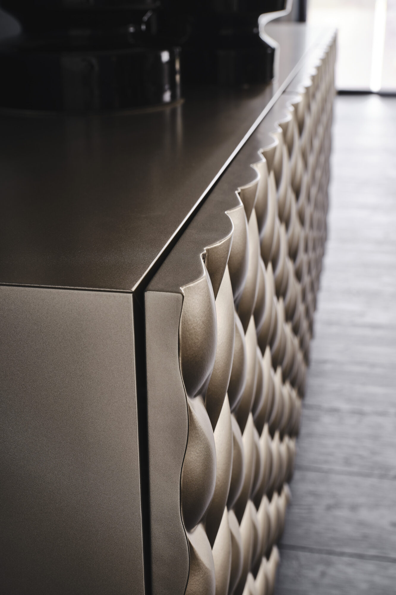 Kredens z opcją 2 lub 3 drzwi z matowego grafitu (OP69) lub tytanowego (M11) lakierowanego drewna, brushed bronze lub brushed grey. Nogi ze stali nierdzewnej polerowanej lub lakierowane w kolorze grafitowym (OP69). Półki wewnętrzne z przezroczystego szkła. Opcjonalnie: szuflada wewnętrzna w każdych drzwiach.