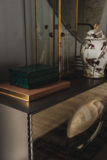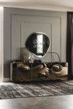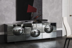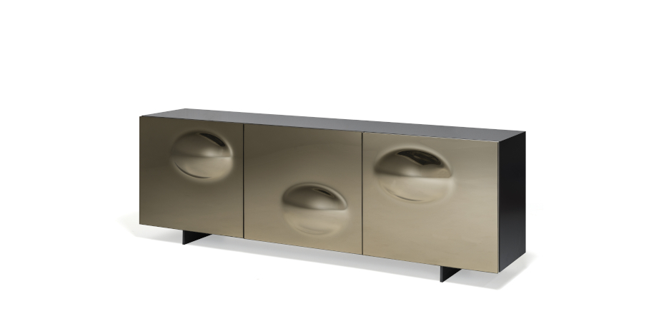 Komoda 2 lub 3-drzwiowa lakierowana na wysoki połysk moka (L4), błyszcząca biel (L7), matowa biel (OP7), matowy grafit (OP69) lub tytan (M11). Drzwi z lustrzanego szkła wypukłego w kolorze szarym lub brązowym z tytanowymi (GFM11) wytłaczanymi profilami aluminiowymi. Stopki ze stali nierdzewnej polerowanej, lakierowane na matowo-biało (OP71) lub grafitowo (OP69). Wewnętrzne półki ze szkła bezbarwnego. Opcjonalnie: szuflada wewnętrzna w drzwiach. Opcjonalnie: blat ze szkła lustrzanego dopasowany do koloru drzwi.