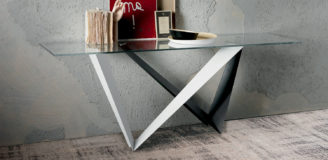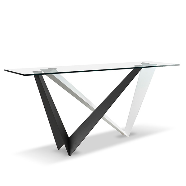 Konsola z podstawą z tytanu (GFM11), bieli (GFM71), grafitu (GFM69), czerni (GFM73) lub mieszanki (GFM69-GFM71), tłoczonej stali lakierowanej lub stali z brązu szczotkowanego. Blat 12 mm z przezroczystego, bardzo przezroczystego szkła lub orzecha włoskiego Canaletto (NC), palonego dębu (RB) lub naturalnego dębu (RN) o nieregularnych, litych krawędziach drewnianych. Niezbędne jest przymocowanie do ściany.