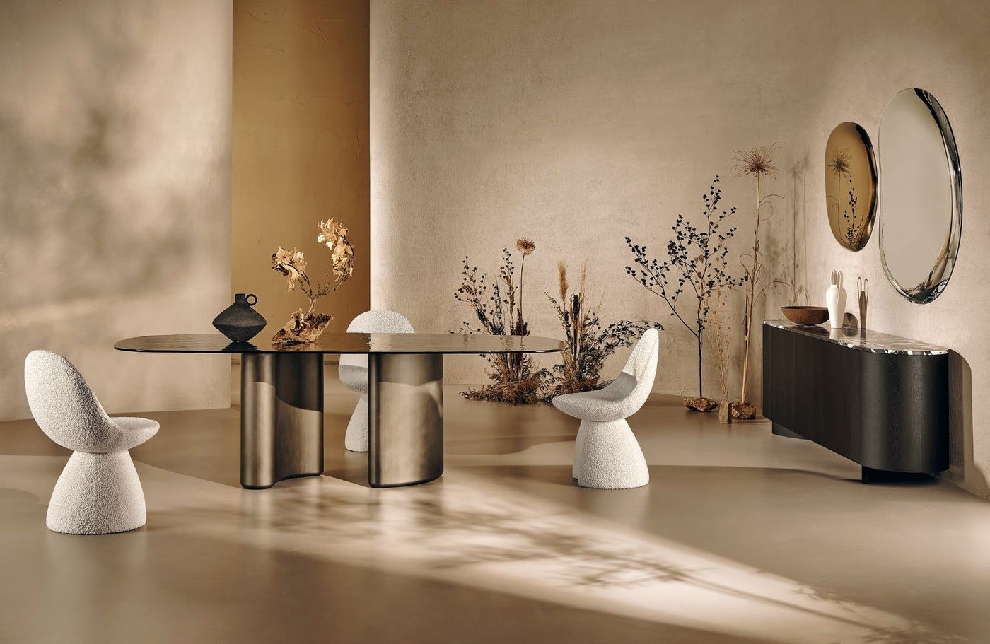 STÓŁ TIDE GLASS 200x110 cm Barrel Top Cast Glass Fumè Base Lite TITATNIU LUXOR